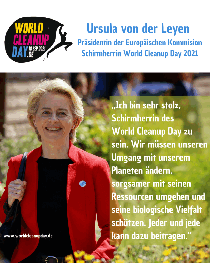 Brüssel/ Berlin – Für den diesjährigen World Cleanup Day am 18.09.2021 übernimmt die Präsidentin der Europäischen Kommission, Ursula von der Leyen, die Schirmherrschaft. „Ich bin sehr stolz, Schirmherrin des World Cleanup Day zu sein. Wir müssen unseren Umgang mit unserem Planeten ändern, sorgsamer mit seinen Ressourcen umgehen und seine biologische Vielfalt schützen. Jeder und jede kann dazu beitragen“, so die Präsidentin.
